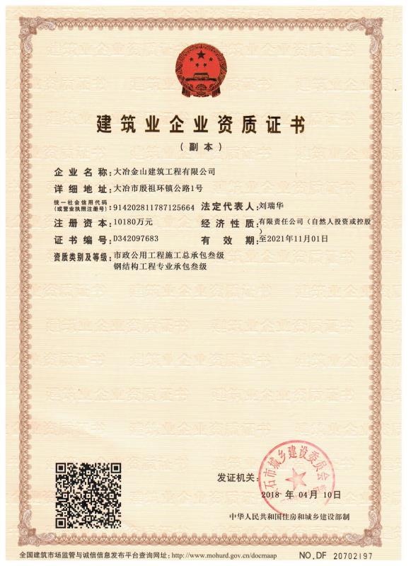 大冶金山建筑工程有限公司始建于1984年,屬鎮(zhèn)辦集體企業(yè)。1997年改制為大冶山建筑工程有限責任公司,屬股份制企業(yè)。2013年更名為大冶金山建筑工程有限公司,2018年3月公司資源重組,公司注冊資金達到10180.00萬元,公司法定代表人為劉瑞華。公司具有古建筑工程專業(yè)承包壹級、建筑工程施工總承包貳級、市政工程總承包叁級、鋼結構工程專業(yè)承包叁級資質。